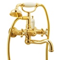 Назначение: ванна+душ • Конструкция: двухрычажный • Монтаж: вертикальный • Материал: покрытие - золото • Подводка: жесткая • Монтажные отверстия: 2 отверстия • Форма излива: традиционная • Душевая лейка в комплекте: есть • Держатель для душевой лейки: на смесителе