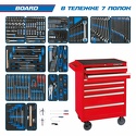 КомплектацияМодуль 1Набор торцевых головок 1/2" с принадлежностями, 37 предметов 9-4537MRVНабор торцевых головок 3/8" с принадлежностями, 44 предмета 9-3544MRVМодуль 2Набор торцевых головок 1/4" с принадлежностями, 65 предметов 9-2565MRVНабор торцевых насадок, бит и ударная отвертка, 43 предмета 9-4143FRVНабор рожковых ключей, 12 предметов 9-1112MRVМодуль 3Набор накидных ключей и TORX L-образных, 19 предметов 9-90119MRVНабор комбинированных ключей, 20 предметов 9-1220MRVМодуль 4Набор напильников, торцевых отверток, съемники клипс и металлическая щетка, 13 предметов 9-90413TQVМодуль 5Набор разрезных ключей и шестигранники Г-образные, 15 предметов 9-90135MRVНабор пассатижей и бокорезов, 4 предмета 9-40104GPVНабор пассатижи, переставные клещи и зажим, 3 предмета 9-40113GPVНабор съемников стопорных колец, 4 предмета 9-44214GPVМодуль 6Набор отверток, 24 предмета 9-31124MRVМодуль 7Набор шестигранников L-тип, 8 предметов 9-22108MRVНабор зубил, выколоток, кернеров с молотком, 8 предметов 9-90118PRVВспомогательный инструментСъемник подшипников 2-х захватный 100 мм 7962-04Съемник подшипников 3-х захватный 100 мм 7963-04Магнит на гибком стержне 5х565 мм 2121-18Отвертка крестовая Phillips №2, 300 мм 14210212Отвертка шлицевая Slotted 6,5 мм, 300 мм 14226512Тестер для проверки напряжения, 3-48 В 9DC23Тележка инструментальная7 выдвижных полок, цвет синий Количество предметов: 325Количество ложементов: 15Размеры тележки в сборе: 460 х 680 х 955 ммУпаковка: картонВес: 88,35 кг
