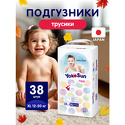 Тип: подгузники-трусики (от 12 до 20 кг) • Количество в упаковке: 38 • Пол малыша: унисекс • Дышащий материал: есть • Резинка на поясе: есть • Барьерчики вокруг ножек: есть • Индикатор наполненности: есть